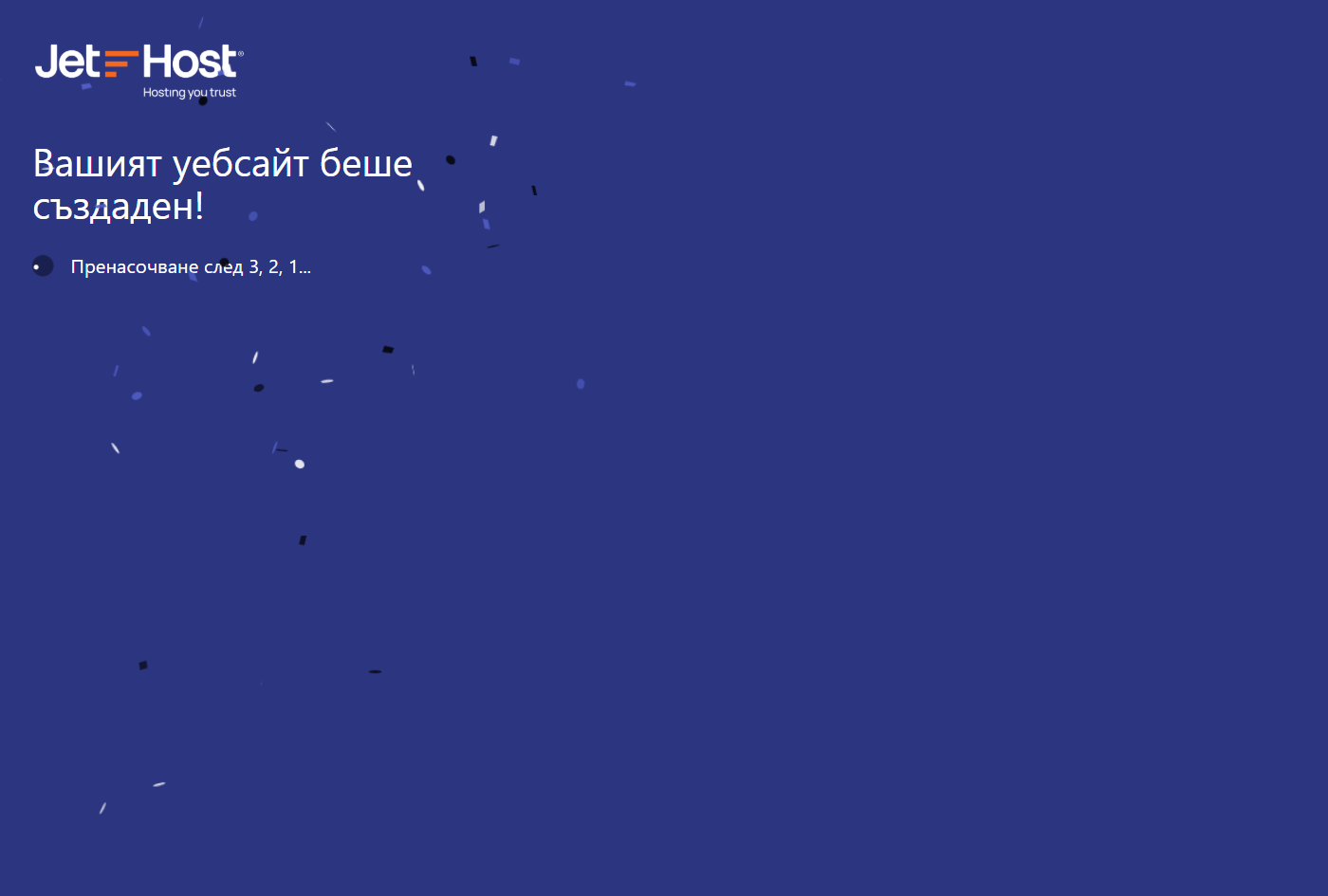 Това отнема по-малко от 2 минути. Ще видиш индикатор за прогреса, а след като завърши, ще получиш съобщение „Вашият уебсайт беше създаден!“ и ще бъдеш пренасочен към новата начална страница.