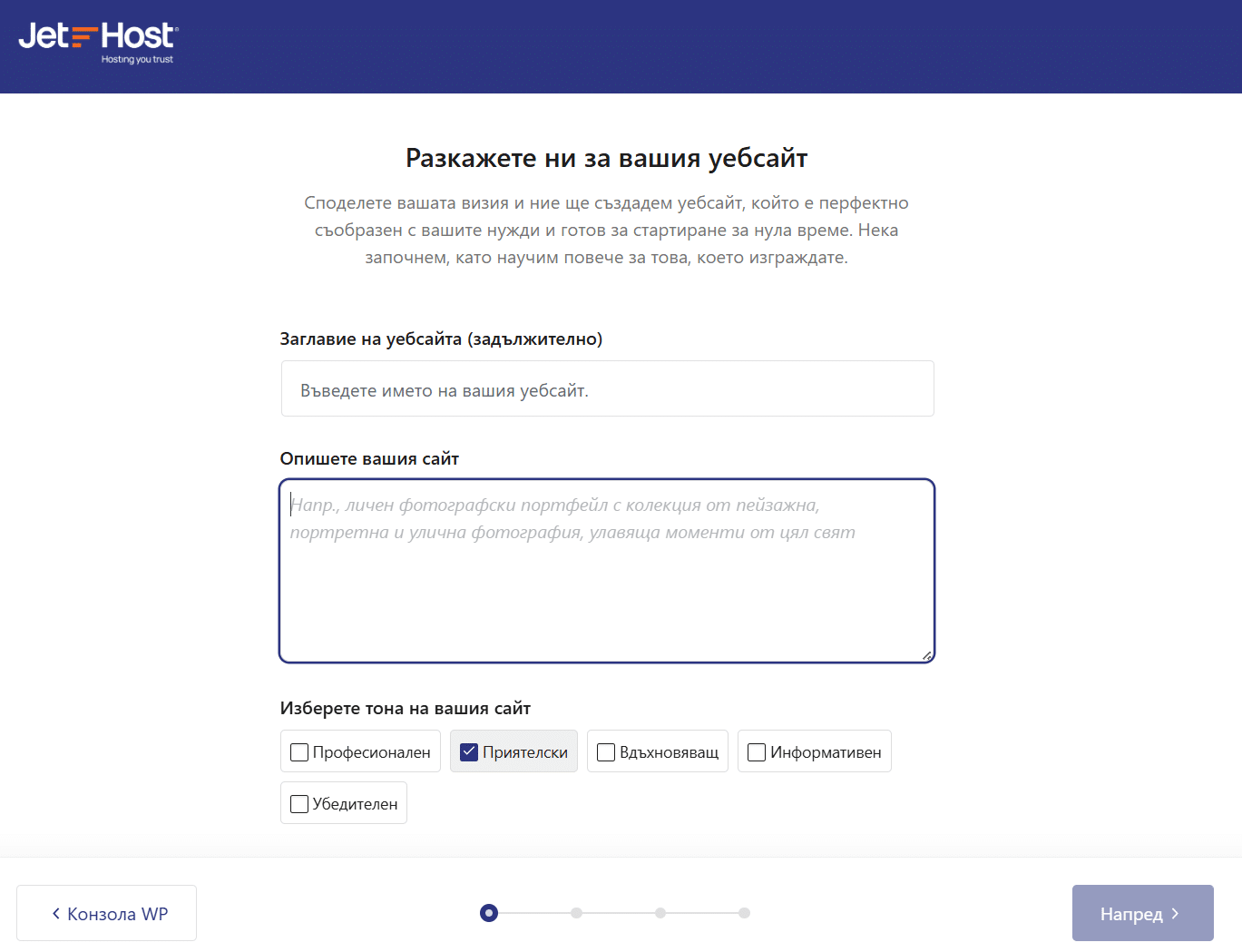 На стъпката „Разкажете ни за вашия уебсайт“ въведи заглавие на сайта, кратко описание на бизнеса и избери стил на текстовете, които ще бъдат генерирани чрез AI помощника (Професионален, Приятелски, Вдъхновяващ, Информативен или Убедителен). Тези данни помагат на AI при създаването на текст и избор на изображения. Натисни Напред, за да продължиш.