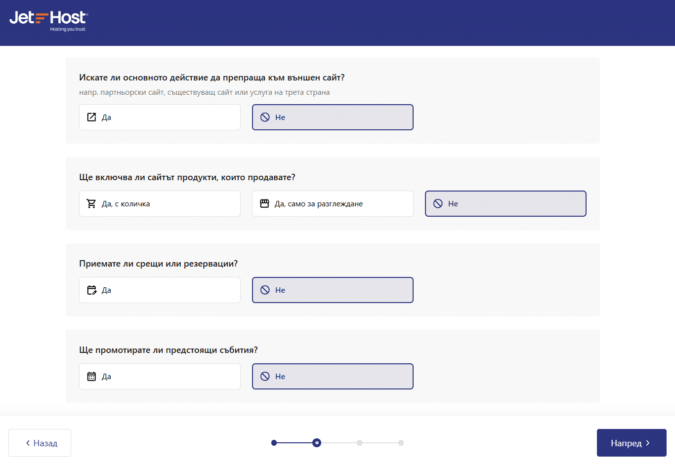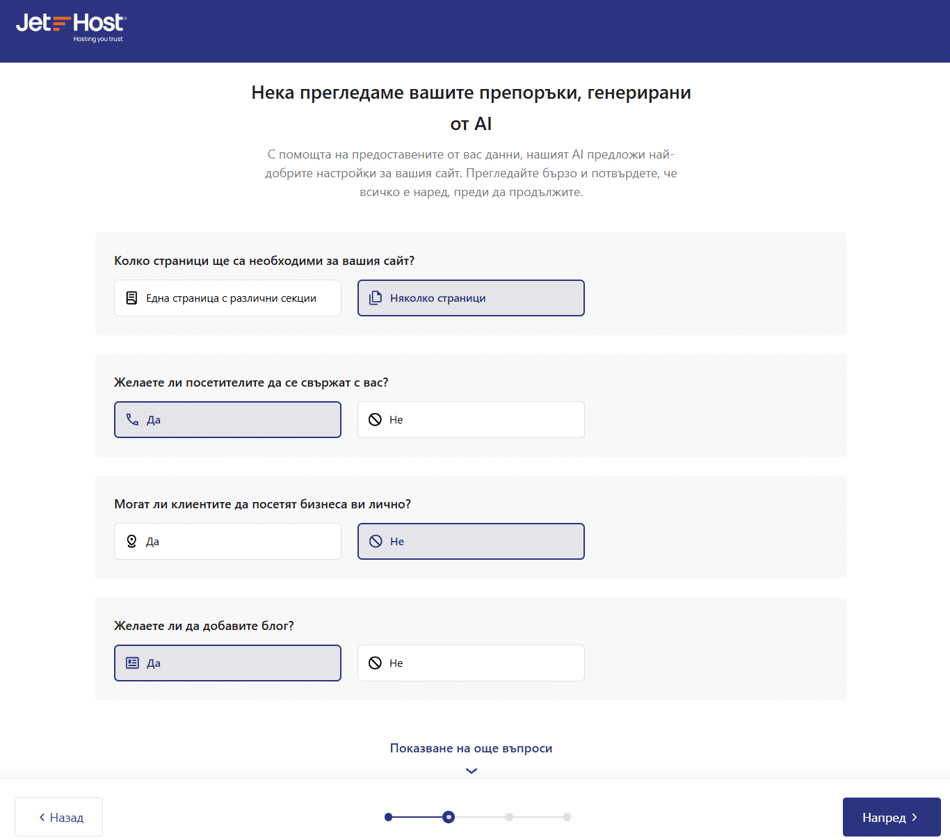 Целта на тази стъпка е да внесе максимална конкретика преди същинското създаване на уебсайта. Избери какви функционалности и информация искаш да включва той. Отговори на въпросите зададени от AI, за да дефинираш ключовите елементи. След това натисни Напред.