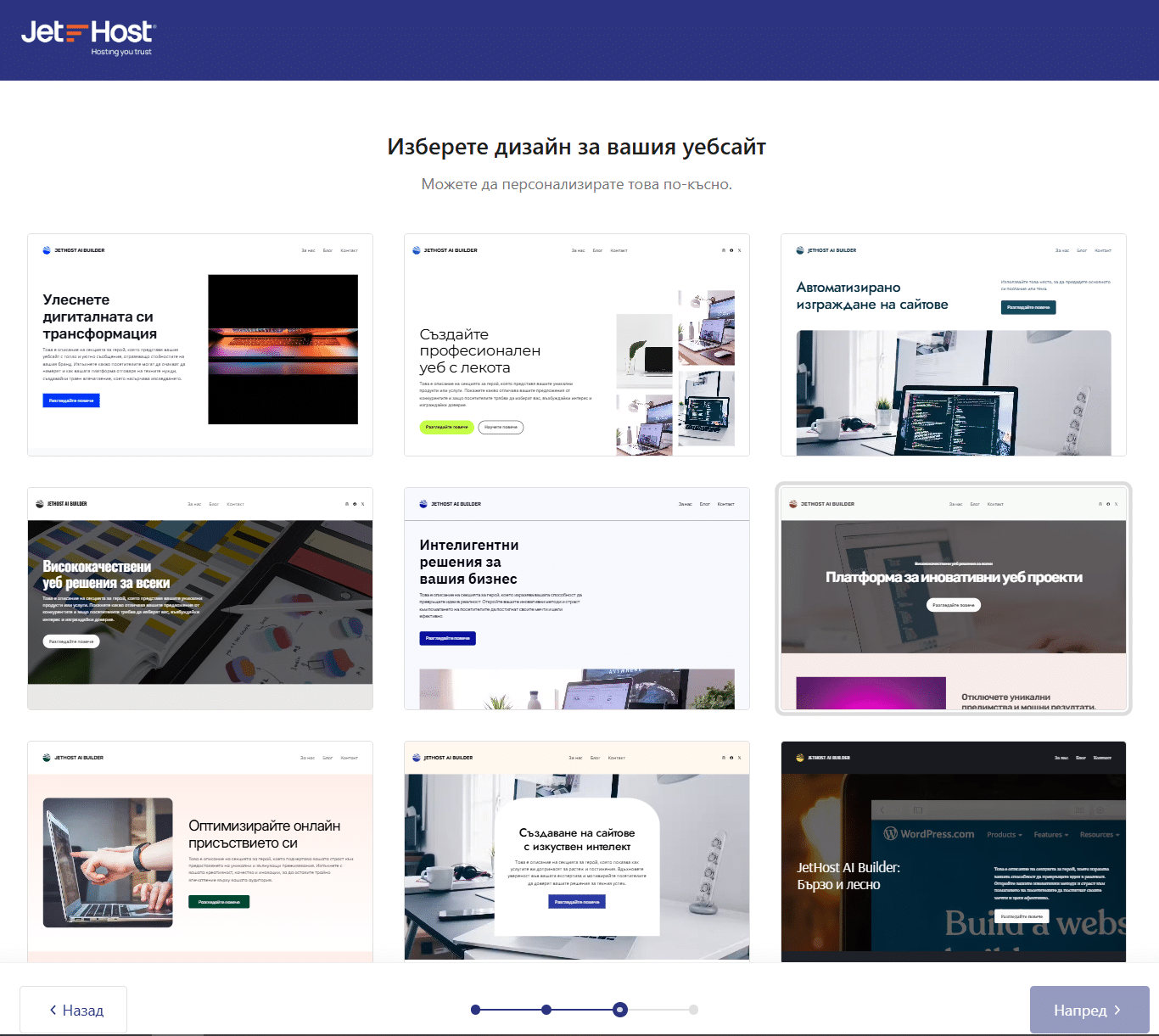 На тази стъпка съветникът ще ти предложи няколко визуални примера. Разгледай варианти с различни оформления, цветове и изображения в хедъра. Избери дизайн, който отговаря на твоята визия за подредба на сайта. Всичко може да се персонализира по-късно. Натисни Напред.