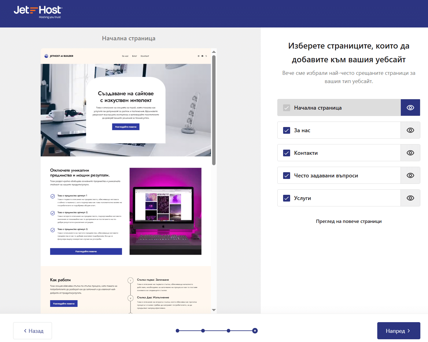 След дизайна отбележи кои страници искаш да включиш. Обикновено опциите са Начало, За нас, Услуги, Контакти, а при онлайн магазин допълнително са добавени и Магазин, Количка. Избери желаните странции и с едно кликване ги добавяш. После натисни Next и… наблюдавай AI-то в действие!